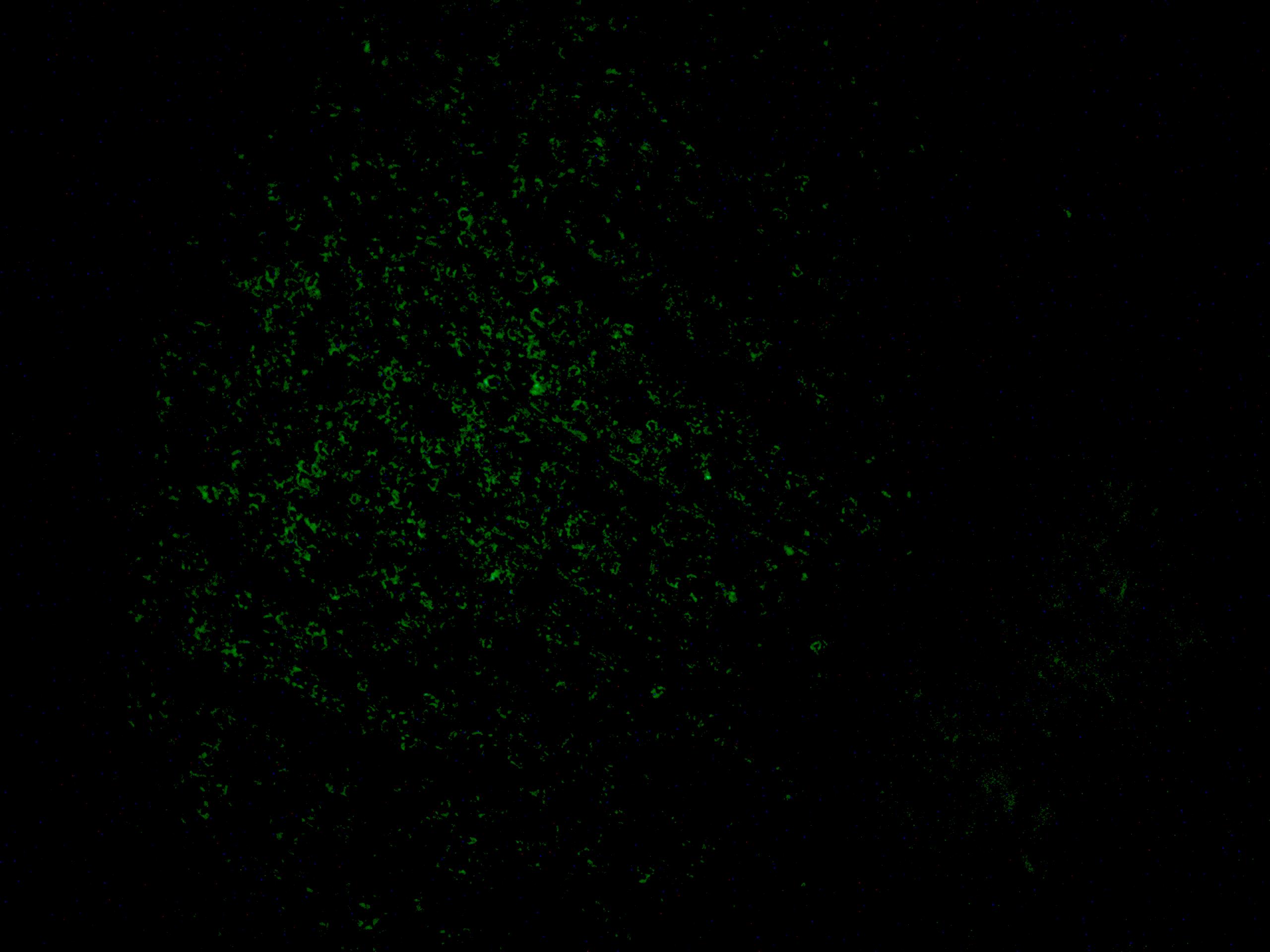 免疫荧光细胞化学是根据抗原抗体反应的原理,先将已知的抗原或抗体标记上荧光素制成荧光标记物,再用这种荧光抗体(或抗原)作为分子探针检查细胞或组织内的相应抗原(或抗体)。在细胞或组织中形成的抗原抗体复合物上含有荧光素,利用荧光显微镜观察标本,荧光素受激发光的照射而发出明亮的荧光(黄绿色或桔红色),可以看见荧光所在的细胞或组织,从而确定抗原或抗体的性质、定位,以及利用定量技术测定含量。